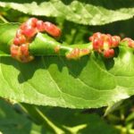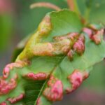 Atacul se manifesta pe frunze – apar pete mici galbui sau rosiatice care se extind, frunza creste mult si devine gofrata (spre interior) si rosie . In final frunzele atacate cad producand defolierea timpurie a pomului. Atacul pe lastari conduce la ingrosarea acestora , oprirea cresterii ( raman mici) , nu se lignifica si de cele mai multe ori se usuca. Pierderea foliajului determina scaderea productiei de fructe.