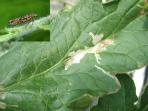 – MOLIA TOMATELOR sau TUTA ABSOLUTA – larvele rod zona de mijloc dintre epidermele frunzei realizand o zona minata sub forma de pata ovala in interiorul frunzei. Produce pagube inseminate putand duce pana la compromiterea totala a culturii.