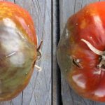 – pe fructe – in toate stadiile de dezvoltare la codita apar pete neregulate , usor adancite de culoare verde-maslinie. Apoi capata o culoare bruna si se extind pe portiuni mari din fruct. Pe suprafata petelor apare si puf fin albicios iar fructele afectate se desprind usor si cad prematur din cauza putrezirii coditei.