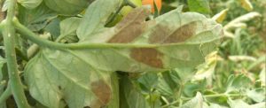 Patarea bruna – cafenie la tomate este cauzata de ciuperca Cladosporium fulvum.