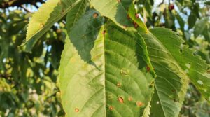 – CIURUIREA FRUNZELOR – atacul se manifesta pe frunze , lastari , ramuri , fructe. Pe frunze apar pete circulare brun-rosietice iar in dreptul lor tesuturile se necrozeaza , se desprind si cad iar frunzele raman ciuruite.