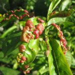 Atacul se manifesta pe frunze – apar pete mici galbui sau rosiatice care se extind, frunza creste mult si devine gofrata (spre interior) si rosie . In final frunzele atacate cad producand defolierea timpurie a pomului. Atacul pe lastari conduce la ingrosarea acestora , oprirea cresterii ( raman mici) , nu se lignifica si de cele mai multe ori se usuca. Pierderea foliajului determina scaderea productiei de fructe.