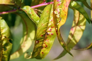 – CIURUIREA FRUNZELOR – atacul se manifesta pe frunze , lastari , ramuri , fructe. Pe frunze apar pete circulare brun-rosietice iar in dreptul lor tesuturile se necrozeaza , se desprind si cad iar frunzele raman ciuruite.